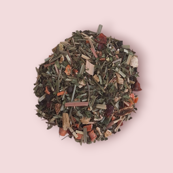 Ingrediënten: Pepermunt, citroengras, wortelstukjes, zoethoutwortels, rozenbottel, citroenschil, zwarte peper.